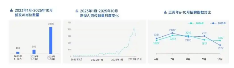 2025年6月开始,招聘市场逐渐回暖,6-10月新经济行业整体新发岗位量超过去年同期。新发AI岗位量、出海岗位量均保持增长。2025年1-10月,AI岗位量同比攀升543%,单月同比增幅最高超过11倍。出海岗位量同比增长16.99%。