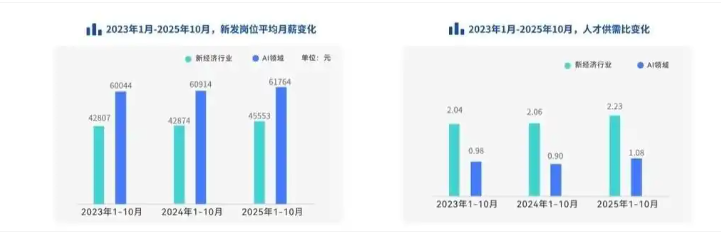 近日,脉脉高聘发布《2025年度人才迁徙报告》(以下简称《报告》)。《报告》显示,2025年1-10月,人才求职压力增加,新经济行业整体人才供需比升至2.23,相当于2.23个人争夺1个岗位,创下近三年新高。初阶职场人求职压力大,面向1年以内工作经验的新发岗位量下降40%。AI人才供需比首次超过1,进入人才供大于求的状态。