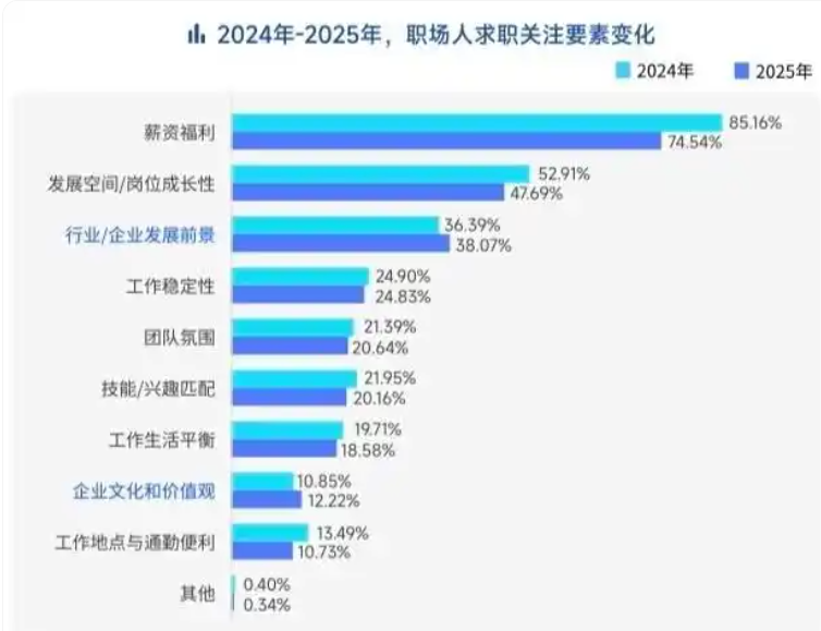 随着招聘市场回暖,职场人的求稳心态出现松动。职场状态“没有变化”的人才占比从2023年的45.30%下降到2024年的41.41%,2025年进一步下降至40.51%,“主动辞职”的人才占比显著上升,达到21.13%,较2023年提升8个百分点,较2024年提升2个百分点。在择业因素方面,求职者对于薪资福利的关注度出现下降,从去年的85%降至74%,对于行业前景、企业文化与价值观的关注度均有小幅上升。