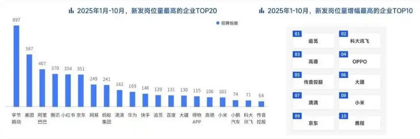 科技大厂持续领跑热招公司。字节跳动新发岗位量断层领先。⼩红书超过京东、⽹易、蚂蚁集团,进⼊整体新发岗位量最大的企业TOP5。追觅成为2025年1-10月新发岗位量增幅最高的企业,其次是科⼤讯⻜和⾼德。