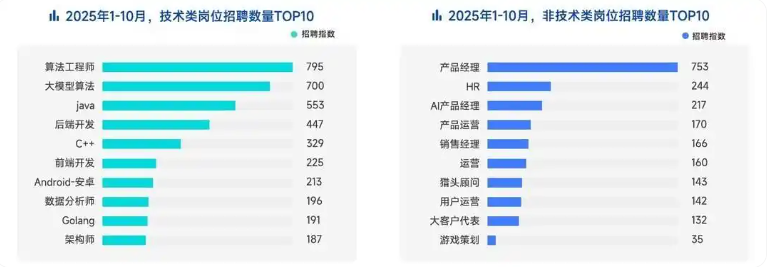 2025年1-10⽉,AI岗位断层领跑热招岗位榜。在热招的TOP10技术岗中,算法⼯程师与⼤模型算法分列第⼀位、第⼆位。这两个岗位也是面向应届生招聘数量最多的岗位。在热招的TOP10⾮技术类岗位中,产品经理、HR分列一二位。AI产品经理位列第三。