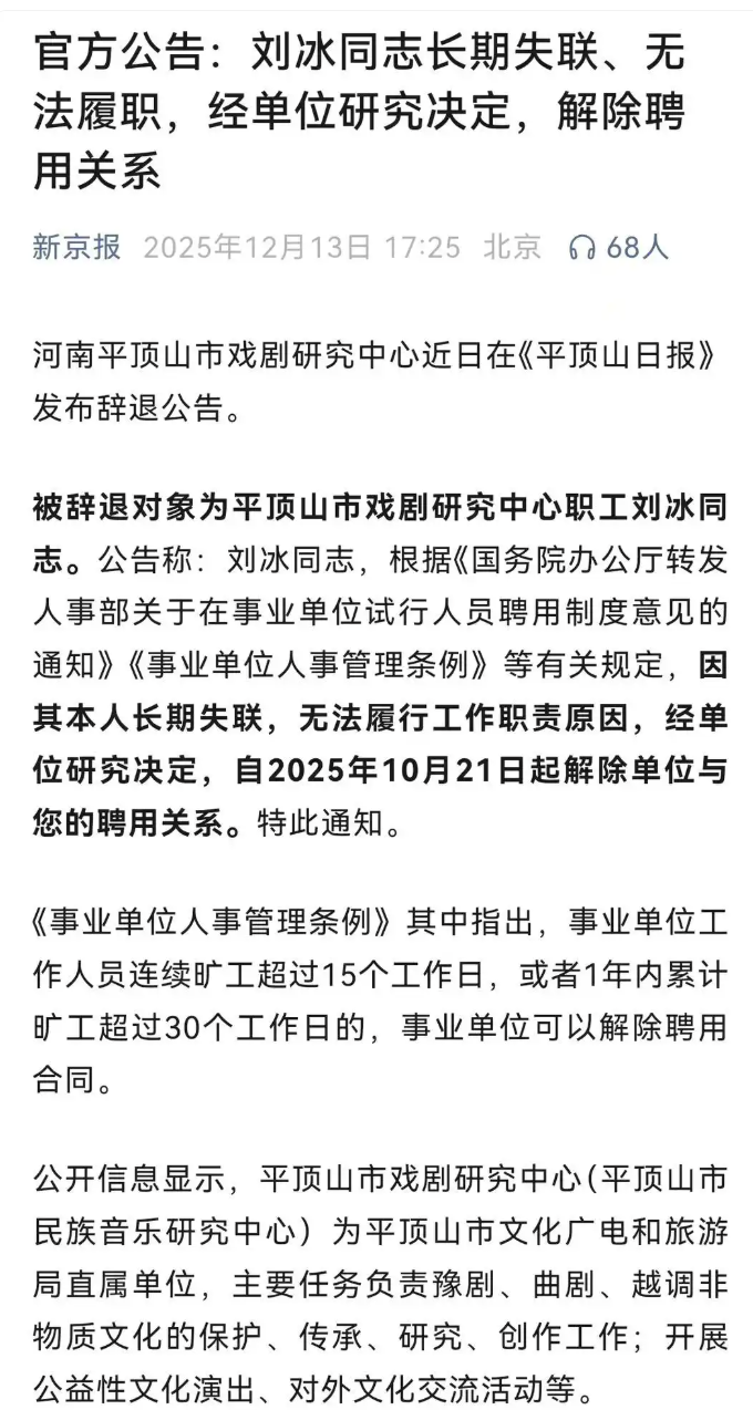据报道,河南平顶山市戏剧研究中心近日在《平顶山日报》发布辞退公告,对象为该中心职工刘冰。公告称,依据《国务院办公厅转发人事部关于在事业单位试行人员聘用制度意见的通知》《事业单位人事管理条例》等相关规定,因刘冰长期失联、无法履行工作职责,经单位研究决定,自2025年10月21日起,解除与刘冰的聘用关系。
