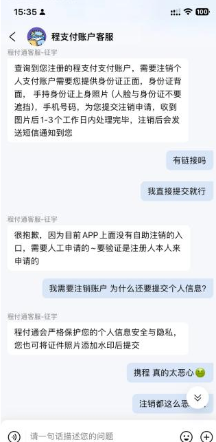 面对持续汹涌的卸载潮和批评声,携程非但未第一时间疏通情绪、澄清疑虑,反而为设置注销门槛。晚一步申请注销的用户,无法使用一键注销功能,只能被迫联系客服操作,甚至被要求提交手持身份证照片。