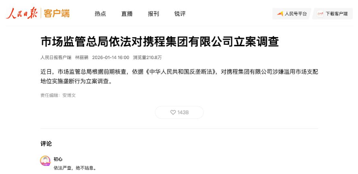 近日,市场监管总局根据前期核查,依据《中华人民共和国反垄断法》,对携程集团有限公司涉嫌滥用市场支配地位实施垄断行为立案调查。