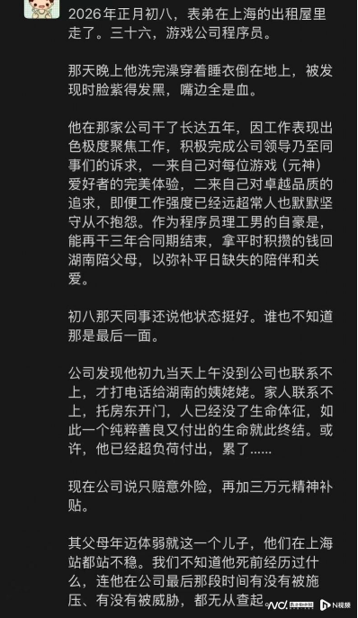 有自称其亲属者在朋友圈发文,“表弟于初八上班后,当晚在家不幸离世。因长期过度劳累、身心透支,骤然离去。”