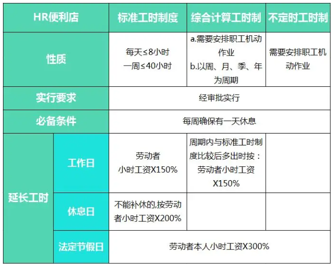 其中标准工时制最为普遍且广为人知,也就是常说的“朝九晚五”了,关于标准工时制相关的加班费计算,大家也是比较熟悉。 今天就来了解一下这三种工时制度具体是怎样的,加班费又该怎么给? 工时即为工作时间制度,为了高效安排工作任务,合理配置员工的时间安排。保障员工合法休息权利的同时,又能进一步提高企业效益,故而每个企业都需要制定自己的工时管理制度或管理办法。 我国现有三种工时制度中,标准工时制最为普遍且广为人知。根据《劳动法》和《国务院关于职工工作时间的规定》(国务院令第174号)的规定,中国目前实行劳动者每日工作8小时,每周工作40小时这一标准工时制。有条件的企业应实行标准工时制。用人单位不得私自延长劳动者工作时间。如果用人单位违法延长劳动者的工作时间,劳动者有权拒绝,若单位强行安排,劳动者可以解除合同。 另外适用标准工时制对企业有以下几点要求: (1)企业每周应保证职工每周至少休息1日; (2)就算是因企业生产经营需要,并且已经与工会和职工协商,一般每天延长的工作时间也不得超过1小时; (3)如果是特殊原因,每天延长工作时间不得超过3小时; (4)企业每月延长劳动者的工作时间不得超过36小时。 综合工时制是指分别以周、月、季、年等为周期,综合计算工作时间,但其平均工作时间和平均周工作时间应与法定标准工作时间基本相同。 企业因生产特点不能实行标准工时制度,且符合条件的经劳动保障行政部门批准可以实行综合工时制度。对于实行综合工时制的劳动者,企业应当根据标准工时制合理确定劳动者的劳动定额或其他考核标准,以便安排劳动者休息。 其工资由企业按照本单位的工资制度和工资分配办法,分别以月、季、年等为周期,综合计算工作时间,但其平均日工作时间和平均周工作时间应与法定标准工作时间基本相同。 也就是说,在综合计算周期内,某一具体日(或周)的实际工作时间可以超过8小时(或40小时),平均每周工作时间不超过四十四小时的工时制度(见《劳动法第三十六条》)。 但综合计算周期内的总实际工作时间不应超过总法定标准工作时间,超过部分应视为延长工作时间并按劳动法的规定支付报酬,其中法定休假日安排劳动者工作的,按劳动法的规定支付报酬。 而且,延长工作时间的小时数平均每月不得超过36小时。如果在整个综合计算周期内的实际平均工作时间总数不超过该周期法定标准工作时间总数,只是该综合计算周期内的某一具体日(或周、或月、或季)超过法定标准工作时间,其不超过部分不应视为延长工作时间。 综合工时制不错!可以用!但不是你想用就能用,划重点啦!!!!(敲黑板)需要向劳动保障行政部门提出申请,获得批准后才能用。 那么,问题又来了,什么叫因生产特点不能实行标准工时制度呢? 以下行业的职工可以实行综合工时制: (1)交通、铁路、邮电、水运、航空、渔业等行业中因工作性质特殊,需连续作业的职工; (2)地质及资源勘探、建筑、制盐、制糖、旅游等受季节和自然条件限制的行业的职工; (3)其他适合实行综合计算工时工作制的职工。 不定时工作制,也叫无定时工时制,它没有固定工作时间的限制,是针对因生产特点、工作性质特殊需要或职责范围的关系,需要连续上班或难以按时上下班,无法适用标准工作时间或需要机动作业的职工而采用的一种工作时间制度。 根据我国《劳动法》以及劳动部的相关规定,不定时工时制度有以下的特点: (1)经批准实行不定时工作制的职工,不受《劳动法》第四十一条规定的日延长工作时间标准和月延长工作时间标准的限制。 (2)实行不定时工作制的职工,用人单位应采取适当的休息方式,确保职工的休息休假权利和生产、工作任务的完成。 (3)实行不定时工作制,除法定节假日工作外,其他时间工作不算加班。 根据劳动部的规定,企业对符合下列条件之一的职工,可以实行不定时工作制: (a)企业中的高级管理人员、外勤人员、推销人员、部分值班人员和其他因工作无法按标准工作时间衡量的职工; (b)企业中的长途运输人员、出租汽车司机和铁路、港口、仓库的部分装卸人员以及因工作性质特殊,需机动作业的职工; (c)其他因生产特点、工作特殊需要或职责范围的关系,适合实行不定时工作制的职工。 《工资支付暂行规定》第十三条规定,经人社部门批准实行综合计算工时工作制的企业,其综合计算工作时间超过法定标准工作时间的部分,应视为延长工作时间,并应按照不低于劳动合同规定的劳动者本人小时工资标准的150%支付劳动者延长工作时间的工资。 企业应该合理安排时间,否则仍需要支付劳动者因超时工作的加班费。对于超过部分,企业应按照不低于劳动合同规定的小时工资标准的150%支付加班工资。如用人单位在法定休假日安排工作的,无论总工时是否超过法定标准工作时长,都应支付300%的加班工资。01标准工时制