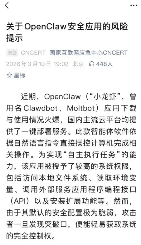 从客服回复来看,钉钉在技术层面显然已经做好了准备。官方接入文档意味着技术团队已经完成了OpenClaw与钉钉生态的对接工作,免费API政策更是一种积极的开发者扶持姿态。但与此同时,客服列举的安全风险也并非空穴来风。国家互联网应急中心3月10日发布“关于OpenClaw安全应用的风险提示”。