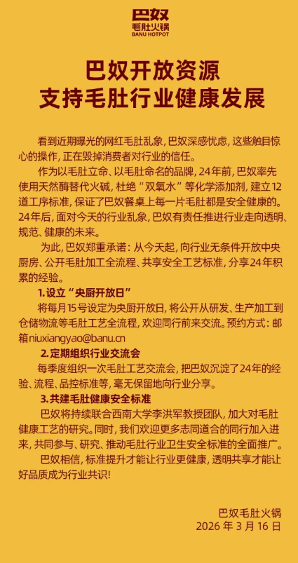 上证报中国证券网讯(记者 伊妹儿)“巴奴毛肚火锅”微信公众号3月16日发布文章称,从今天起,向行业无条件开放中央厨房、公开毛肚加工全流程、共享安全工艺标准。